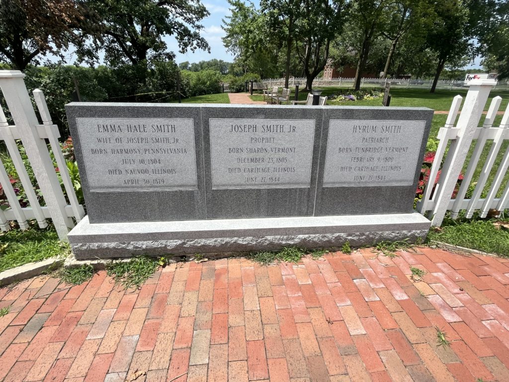 The location of the grave marker of the prophet Joseph Smith, his wife Emma Smith and the prophets brother Hyrum Smith is in the Smith Family Cemetery in Nauvoo Illinois. The Smith Family Cemetery is a small plot of land adjacent the home of Joseph Smith. The Smith homestead is one of the homes closest to the entrance of the small town of Nauvoo. The homestead is very close to the Mississippi River and has a plot of land next to it now known as the Smith Family Cemetery, where the Joseph Smiths Family buried their loved ones. The Smith Family Cemetery is in between the Red Brick store(where the Relief Society was organized) and the Smith Family Homestead. Many of the Smith family homes and businesses are located very close to one another right around the cemetery.
